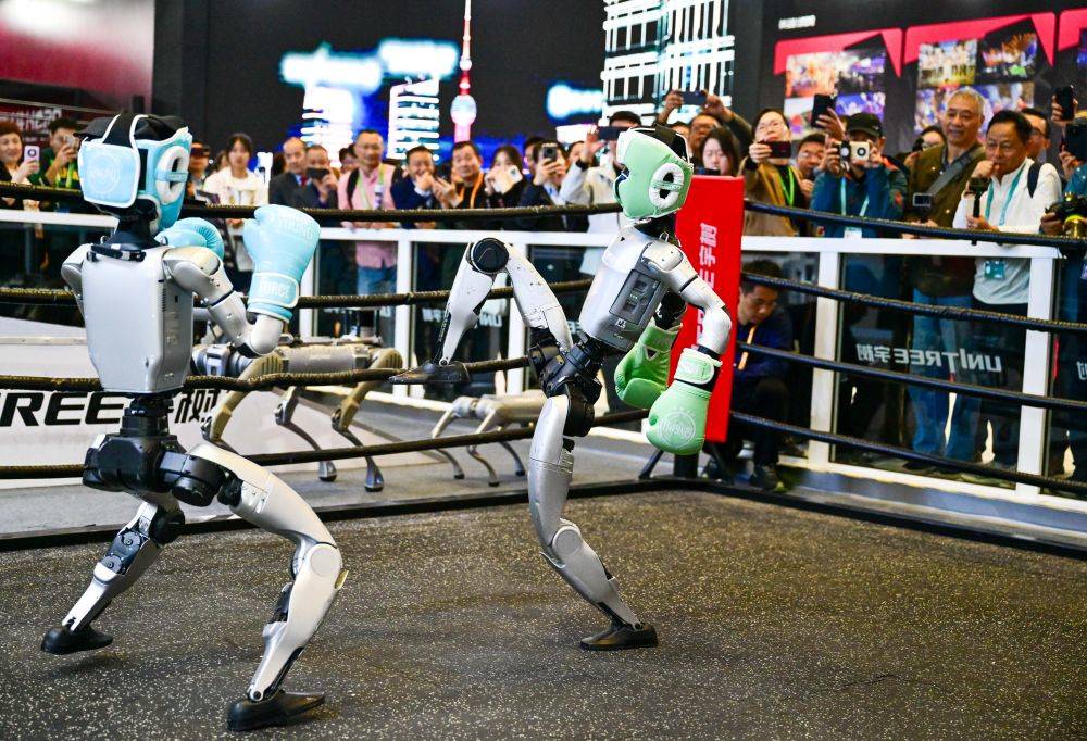 2025年11月6日,人形機器人在第八屆進博會宇樹科技展臺進行格斗表演。當日,在技術(shù)裝備展區(qū)宇樹科技展臺,兩臺G1人形機器人的格斗表演吸引了眾多觀眾。它們戴著護具及拳套,施展直拳、勾拳、左右鞭腿,展示倒地自主起身等復雜動作,不時贏得觀眾喝彩。