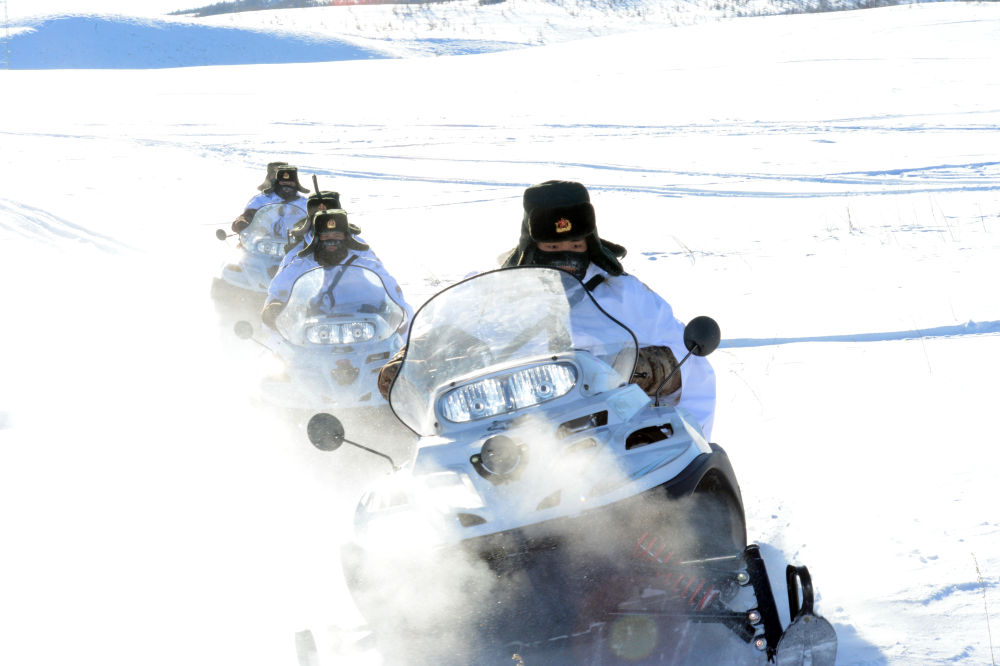 北部戰(zhàn)區(qū)陸軍某旅三角山邊防連官兵駕駛摩托雪橇執(zhí)勤。新華社發(fā)(2014年1月攝)