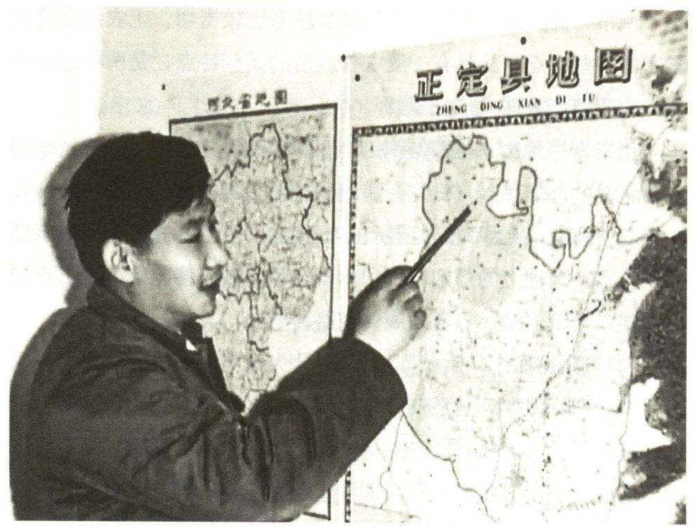 年輕的習(xí)近平在辦公室地圖前謀劃正定的發(fā)展。